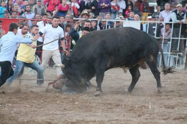 Bir süre boğanın boynuzları önünde yerlerde sürüklenen şahıs diğer değnekçilerin yardımıyla kızgın boğadan kurtarıldı.