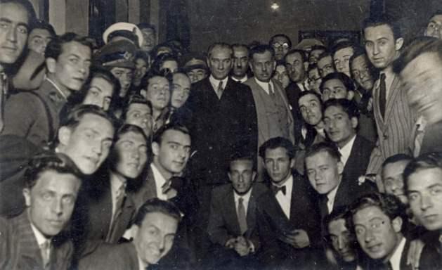 Mustafa Kemal Atatürk'ün İstanbul Üniversitesi'ni ziyaretinde öğrencilerle çekilmiş fotoğrafı.
