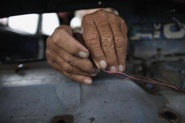 Otomobili çalıştırmak için düz kontak yapan Oscar, vites kolu yerine de su borusu yerleştirmiş.