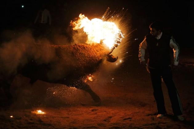 Bazı seyirciler de alana atlayarak hayvanı daha da korkutmaya çalışırken, yerdeki alevler de hayvanın büsbütün paniğe sürüklüyor.