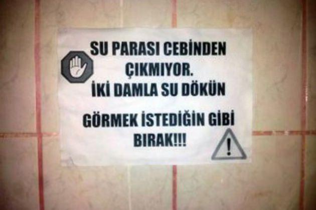 İki Damla Su Dökün! Gümüşhane kent merkezinde bir tuvalete "yurdum insanı" dedirtecek türden bir ilan asıldı. İl merkezindeki bir işhanının tuvaletine giren vatandaşlar, işyeri sahibinin yüksek su faturalarından muzdarip olduğu anlaşılan bir ilanla karşılaşıyor. Tuvalet kapısının tam karşısına asılan ilanda "Su parası cebinden çıkmıyor, iki damla su dökün. Görmek istediğin gibi bırak" ifadeleri yer alıyor.