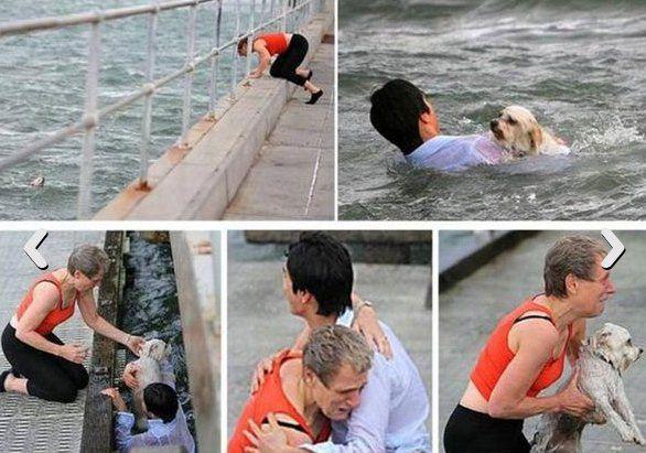 Denize düşen minik köpeği yaşlı sahibi kurtaramayınca imdanına yardımsever bir adam yetişti.