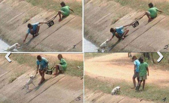 İki arkadaş köpeği kurtarıyor.