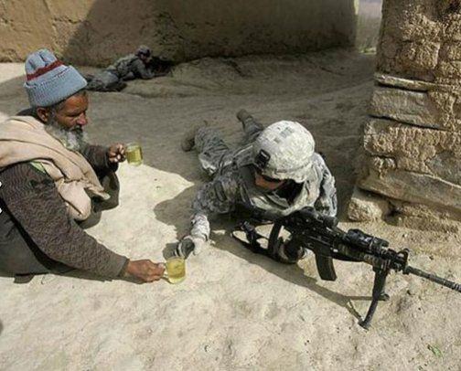 Afgan vatandaş Amerikalı askere çay ikram ediyor.