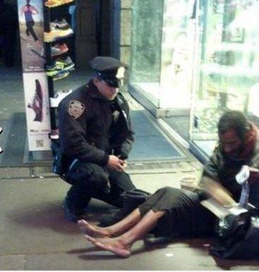 Newyork polisi, evsiz bir adama çizme ve termal çorap verirken.