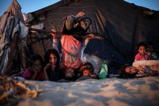 İsrail ablukasının devam ettiği Gazze kentinin Yunus köyünde çadırda yaşayan Ahmed Nveb`in ailesi, zor şartlar altında yaşam mücadelesi veriyor. Hayvancılıktan elde ettikleri gelirle geçinmeye çalışan ailenin çocukları oyunlarla günlerini geçiriyor. 13/07/2013 (Mohmoud Hamda - Anadolu Ajansı)