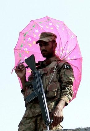 Pakistan`da 11 Mayıs genel seçimlerinden sonra parlamento ve eyalet meclislerindeki boş sandalyeler için yapılan ara seçimlerde yoğun güvenlik önlemleri alınmıştı. Güvenlik görevlilerinden birinin tuttuğu şemsiye ilgi çekmişti. 22/08/2013 (Muhammad Reza - Anadolu Ajansı