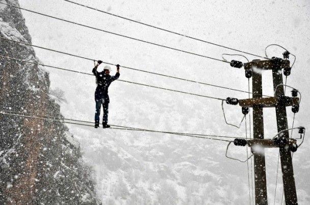 Hakkari-Çukurca Karayolu’nda bulunan enerji nakil hatlarındaki arazılar nedeniyle, Vedaş İl Müessese Müdürlüğü ekipleri güç koşullar altında elektrik direklerine çıkarak onarım çalışmaları yapmıştı. 11/01/2013 (Nevzat TAŞ - Anadolu Ajansı)