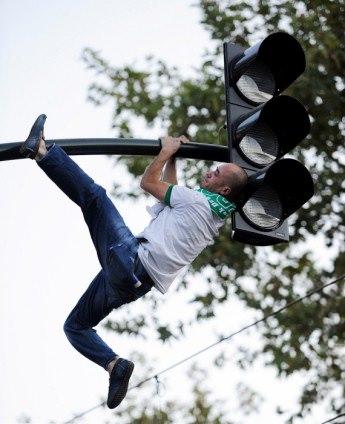 Spor Toto Süper Lig`deki Bursaspor-Beşiktaş maçı öncesi Bursasporlu taraftarlar stadyum caddesinde takım otobüsünü karşılamış, bazıları sinyalizasyon direklerine çıkmıştı. 15/09/2013 (Ali Atmaca - Anadolu Ajansı)