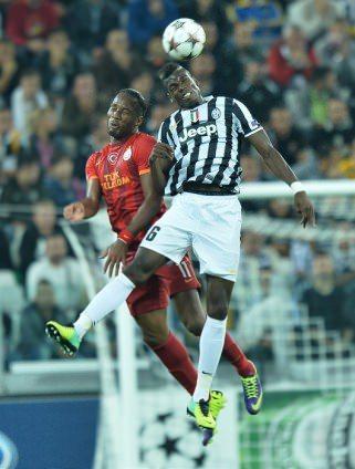 UEFA Şampiyonlar Ligi B Grubu ikinci maçında Galatasaray, deplasmanda Juventus ile karşılaşmış, bir pozisyonda Galatasaraylı futbolcu Didier Drogba (solda), Paul Pogba (sağda) ile mücadele etmişti. 02/10/2013 (Mustafa Yalçın - Anadolu Ajansı)