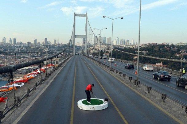 Dünyaca ünlü golfçü Tiger Woods, Boğaziçi Köprüsü`nde Asya kıtasından Avrupa kıtasına atış yapmıştı. 05/11/2013 (Onur Çoban - Anadolu Ajansı)
