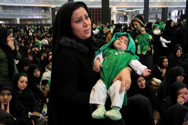 İran’da düzenlenen Ali Asgar Günü yas törenlerinde Şii mezhebine mensup Müslümanlar, bebeklerine Ali Asgar‘ın sembolü olan yeşil ve beyaz kıyafetler giydirmişti. 08/11/2013 (Fatemeh Bahrami - Anadolu Ajansı)