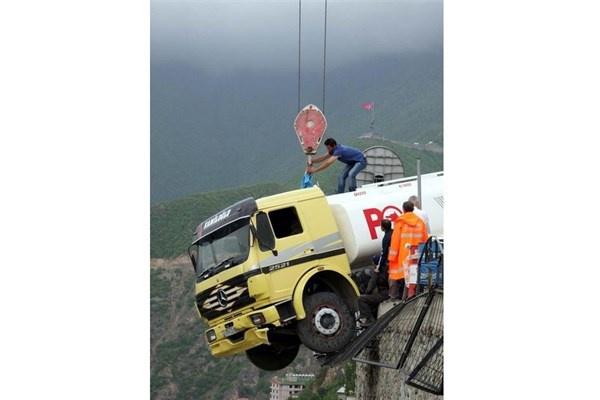 Artvin'de kayan mazot yüklü tanker, yaklaşık 15 metre yüksekliğindeki istinat duvarı üzerinde durabilmiş, vinçle yaklaşık 5 saat süren çalışma sonucu kurtarılmıştı. 03/06/2013
