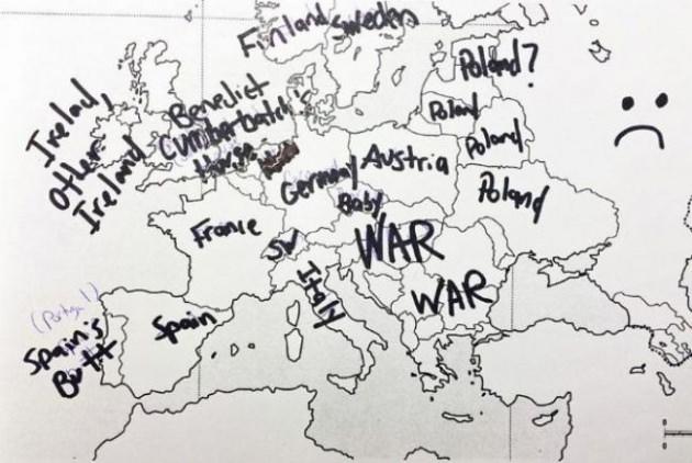Bu öğrenci ise Türkiye'yi bulamadığı gibi Avrupa'nın doğusunu Polonya ile doldurmuş. Yugoslavya'nın ise halen dağılma sürecinde olduğunu düşünerek o bölgenin üzerine "savaş" yazmış.