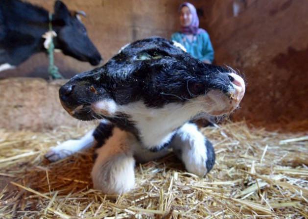 Fas'ta Sefrou köyünde dünyaya gelen iki kafalı buzağı, görenleri şaşırtıyor.