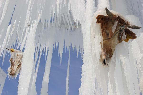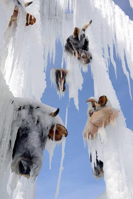 Erzurum'da, Atatürk Üniversitesi Güzel Sanatlar Fakültesi (GSF) Resim Bölümü öğretim üyesi Prof. Dr. Mehmet Kavukçu, soğuk hava ve şiddete dikkat çekmek için kombinadan aldığı öküz başlarıyla buzdan yararlandı. İlginç proje görenleri dehşete düşürürken Prof. Dr. Kavukçu, "Proje amacına ulaşmıştır" dedi. İşte o projeden görüntüler...