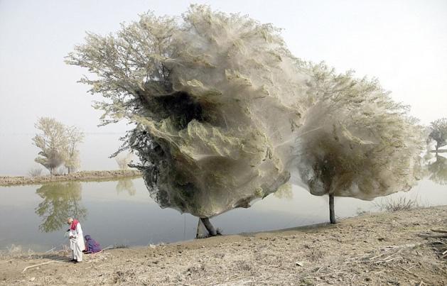 Pakistan’ın Sindth bölgesi geçtiğimiz aylardan ilginç bir duruma sahne oldu. Milyonlarca örümcek bir anda bölgedeki ağaçları istila etmeye başladı ve kocaman ağaçlar örümcek ağlarıyla çepeçevre kaplanıverdi.