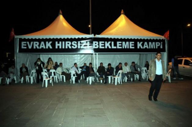 Üzerinde 'Evrak Hırsızı Bekleme Kampı' yazılı dev çadırda bekleyen AK Partililer, evrakların kaçırılmaması için burada bekleyeceklerini kaydetti.