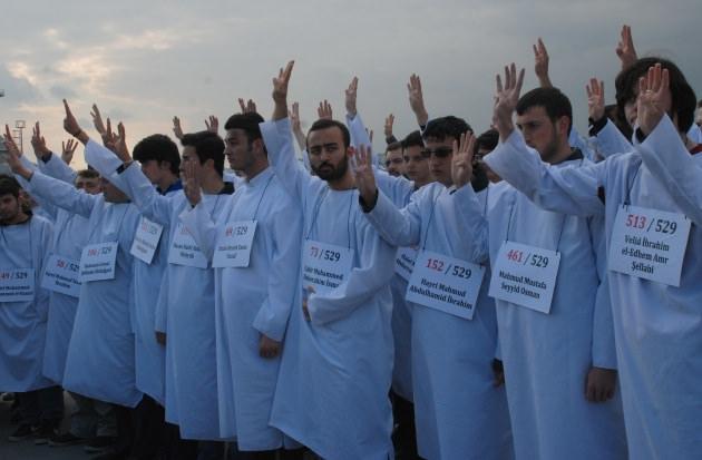 Bir süre sonra ayağa kalkan bu kişiler, hep bir ağızdan 'Öldük sandınız, ölen insanlığınız ve herkes dirilecek' şeklinde slogan attı.