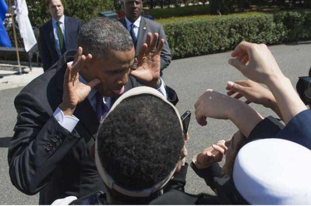 Fotoğrafının çekildiğini fark eden ABD Başkanı Barack Obama, iki baş parmağını yüzüne dayayarak oynatmaya başladı. Obama'nın bu şakası etrafta bulunanlar tarafından kahkahayla karşılandı.