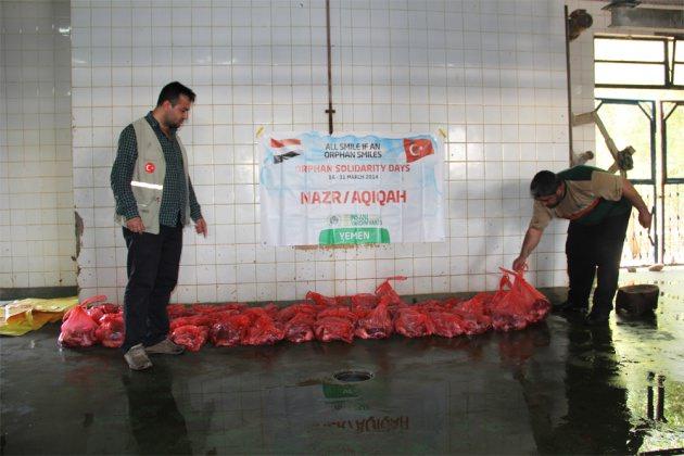 Yetimler ve aileleri için kesilen adak-akika kurbanlarının etleri, poşetlenerek ailelere tek tek teslim edildi.