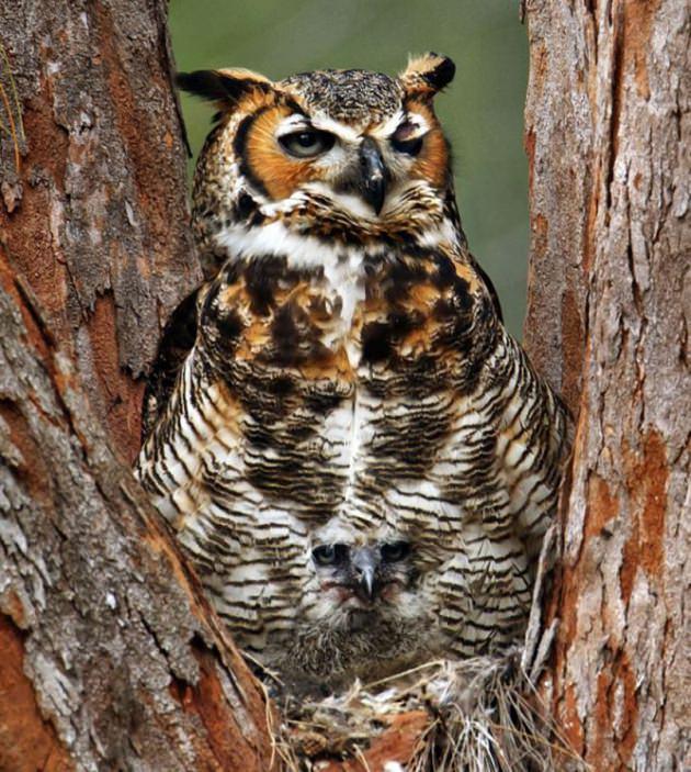 Fotoğrafçı Marina Scarr, parkta bir baykuşun fotoğrafını çekti. Scarr, daha sonra fotoğrafta bir değil iki baykuş olduğunu görerek şaşırdı. Florida'da Desoto Park'ta anne baykuşun, yavrusunu mükemmel bir şekilde kamufle ettiği görülüyor.