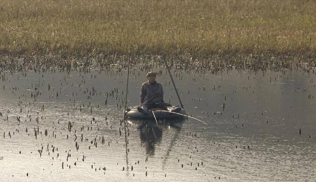Eski bir tekerleği kendisine bot yapan bu adam, balık tutup taze yiyecek bulmanın peşinde.