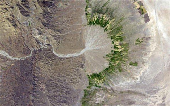 İran'ın güneyinde kurumuş bir nehrin ağzındaki taşınmış alüvyonlar fotoğrafta çok net görülebiliyor. Fotoğraf ASTER'den 2004 yılında çekildi.