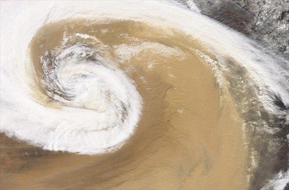 2001 yılında Çin'de bir kum fırtınası, Fotoğrafta toz fırtınası bulutlarla karışmış. Fotoğrafta görülen beyaz bulutun genişliği 200 km civarında.