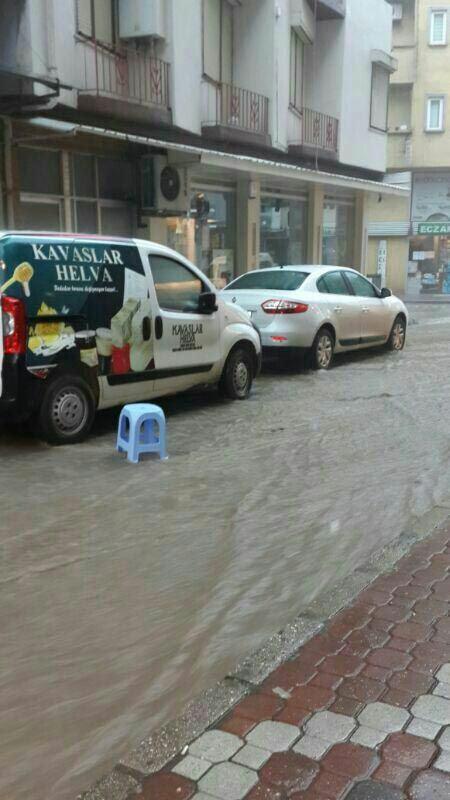 CANAKKALE'NIN BIGA ILCESI'NDE BUGUN OGLEN SAATLERINDE ANIDEN BASTIRAN SAGANAK YAGMUR NEDENIYLE CADDELER VE SOKAKLAR DEREYE DONERKEN, ONLARCA EV VE ISYERINI SU BASTI. SELIN GETIRDIGI SULARLA BAKACAK CIFTLIGI KOYU YOLU ZARAR GORDU.