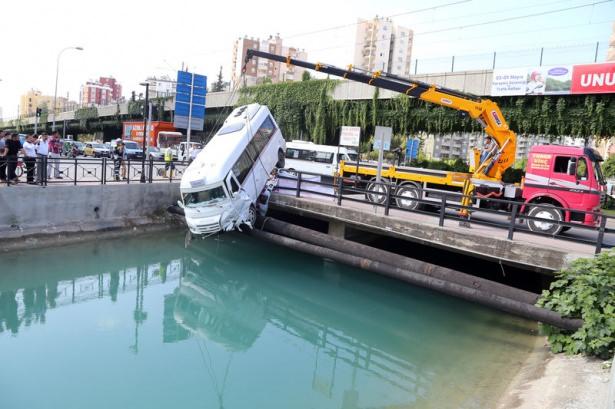 Otomobille çarpışan minübüs köprüde asılı kaldı