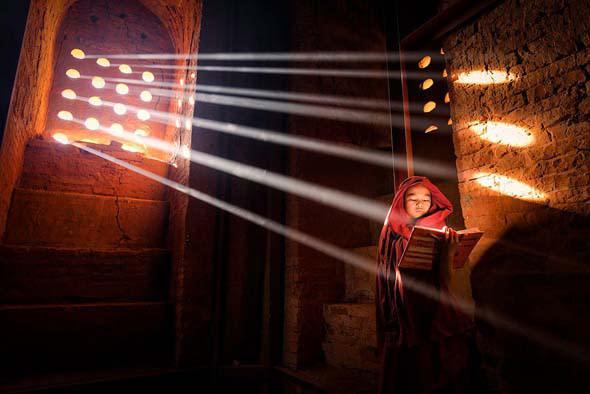 Genç keşiş mükemmel bir ışık kaynağı bulunan pagodası içinde kitap okuyor. Eski Bagan, Myanmar. Marcelo Castro