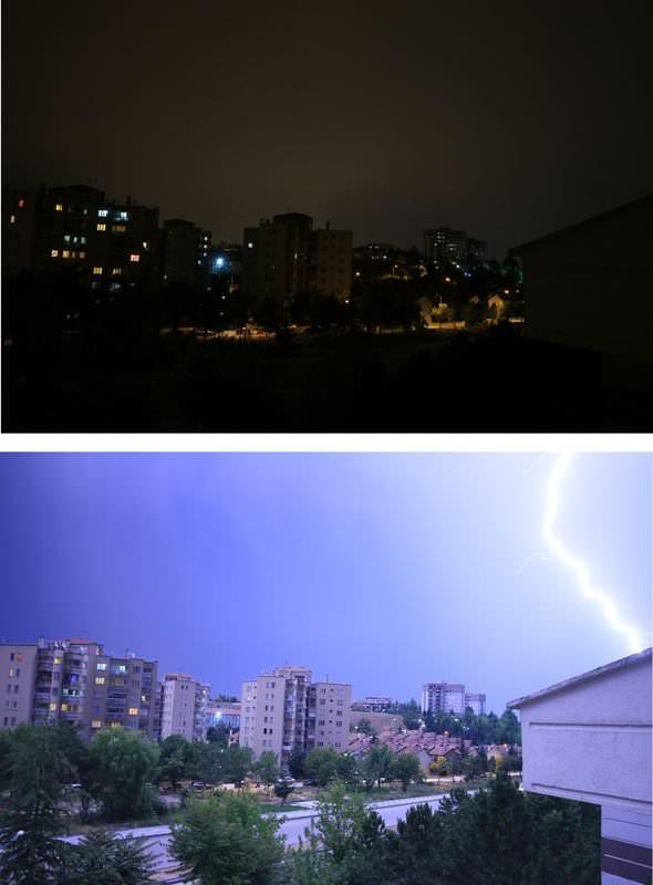 Başkent Ankara semalarını aydınlatan şimşekler şehrin ışıklarıyla ve silüetiyle bütünleşti. Bir anda aydınlanan şehir adeta gündüze dönüşüyor ve ardından tekrar kararıyor.