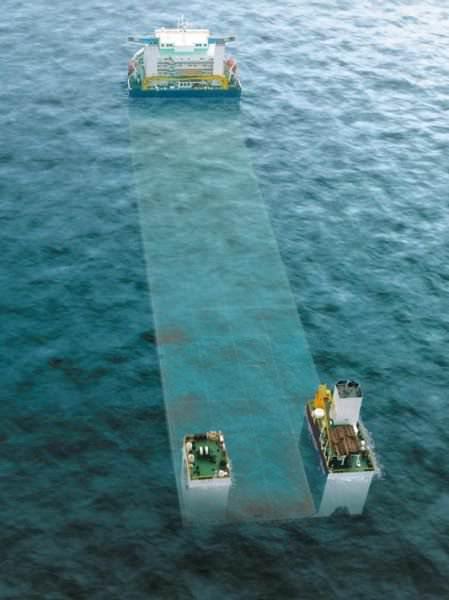 Denizdeki yükünü almadan önce geminin altındaki su tankerleri doldurulup, güvertesinin tamamen suyun içine girmesi sağlanıyor.
