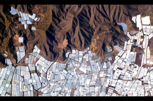 Seralar, Almeria, İspanya On binlerce hektarlık plastik kaplı tarım alanları uzaydan böyle görünüyor.