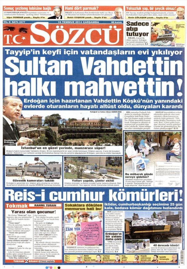 16 Temmuz 2014 gazete manşetleri