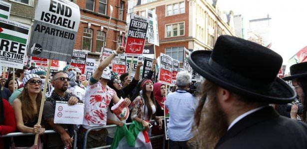 Londra'da on binlerce kişi "Filistin'e özgürlük", "Gazze'deki işgale son", "Gazze'deki katliama son" sloganları attı.