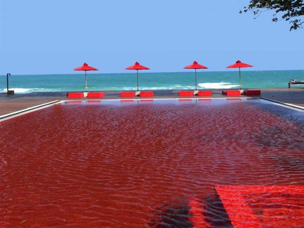 Tayland'daki Library adlı havuz, kırmızı tabanıyla deniz mavisine oldukça tezat bir görüntü çiziyor.