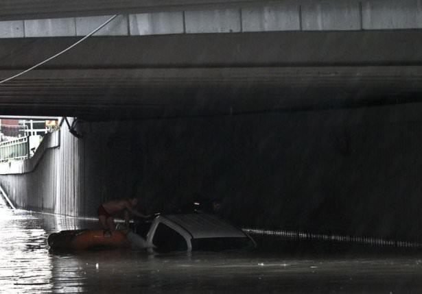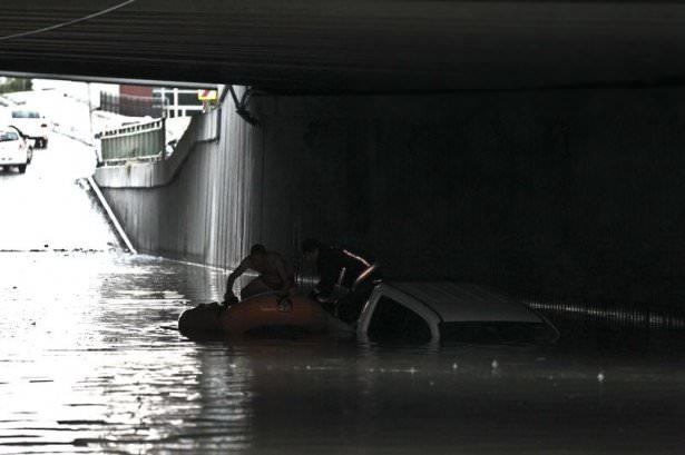 Ambarlı Kavşağı'nda 3 araç suya gömülürken, araçların üzerinde mahsur kalan 3 kişi botlarla kurtarıldı.