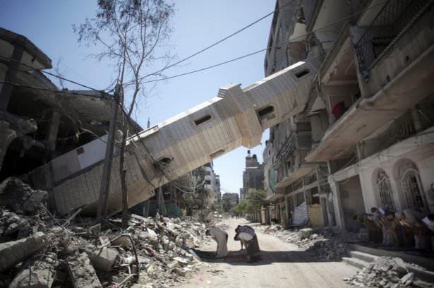 İsrail tarafından bombalanan camide toplanan Gazzeliler okunan hutbenin ardından cuma namazını eda etti. Yıkık bir minarenin gölgesinde namaz kılan Filistinliler, bölgedeki yabancı bir foto muhabirin kamerasına böyle yansıdı.