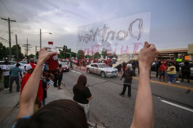 Yer yer trafiği kapatan protestocular ellerini yukarı kaldırarak "Ellerimi kaldırdım, beni vurma", "Michael için adalet", "Adalet yoksa barış yok" sloganları attı.