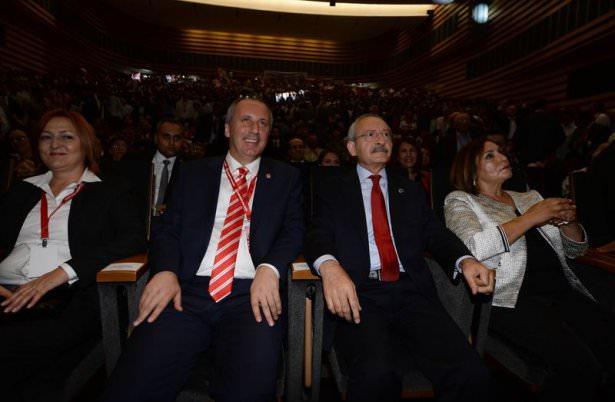 Salonda Genel Başkanlık için yarışan Kemal Kılıçdaroğlu ile Muharrem İnce yan yana koltuklarda oturuyor.