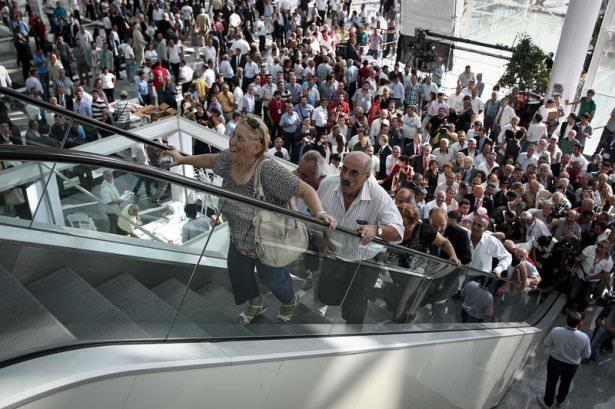 CHP'nin 18. Olağanüstü Kurultayı'nın gerçekleştiği ATO Kongre Merkezi'ne gelen partililerden bazıları ters yönde yürüyen merdivenleri çıkmaya çalıştı.