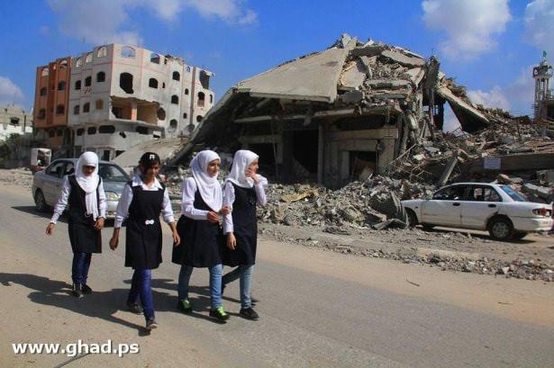Filistinli çocuklar, yıkık binaların arasından geçerek Birleşmiş Milletler Filistinli Mültecilere Yardım Kuruluşu'na (UNRWA) ait okullara doğru yürüyor.