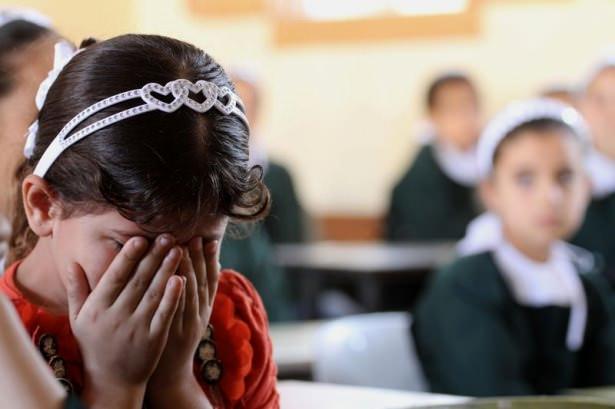 İsrail saldırılarında sıra arkadaşını kaybeden bir kız gözyaşlarını tutamıyor.