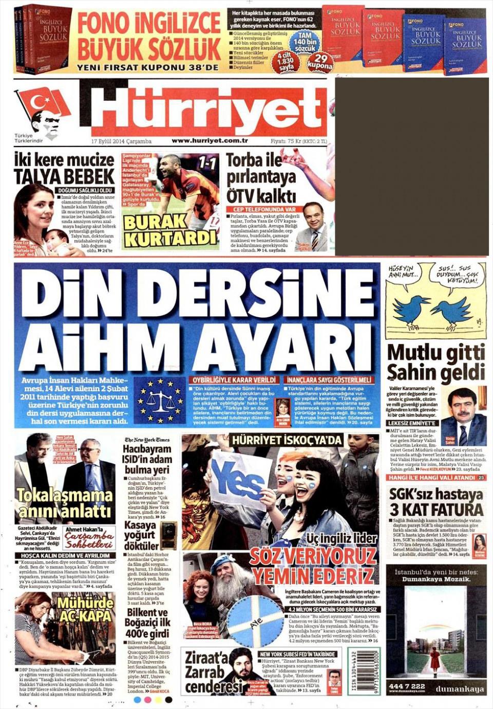 17 Eylül 2014 gazete manşetleri