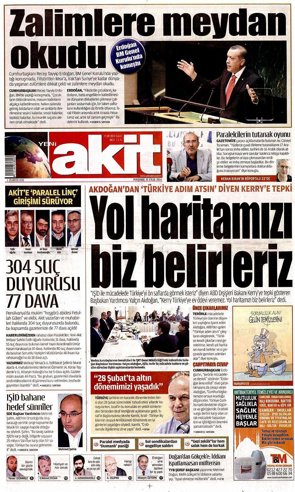 25 Eylül 2014 gazete manşetleri