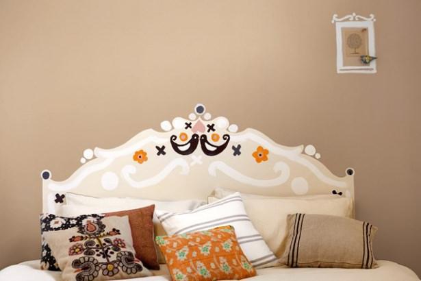 Yatak başınızı boyamak veya yapışkanlı süslerle dizayn etmek yatak odanıza bolca yaratıcılık katacaktır. Duvar renginizle aynı tondan fakat onun kontrastı bir rengi tercih etmenizi tavsiye ederiz.