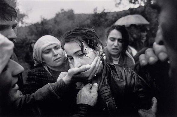 Kosova'ya Özgürlük Ordusu savaşçısı olan kocasının öldürülmesinin ardından akraba ve dostları cenazede acılı kadını rahatlatmaya çalışıyor