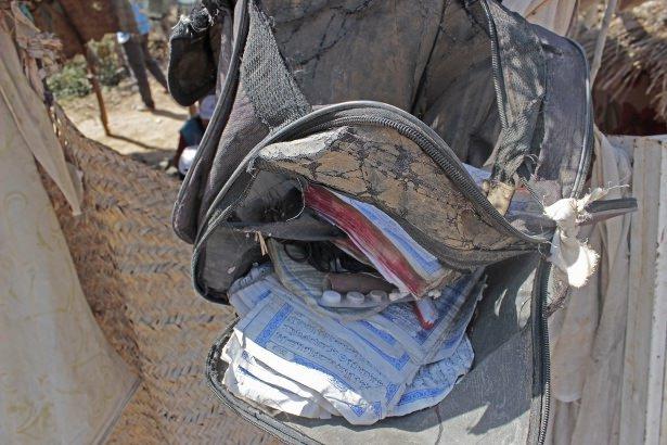 Talebenin birine ait olan bu çantanın içinde sayfaları yırtılmış mushaflar (Kur'an) ve birkaç ilaç bulunuyor.